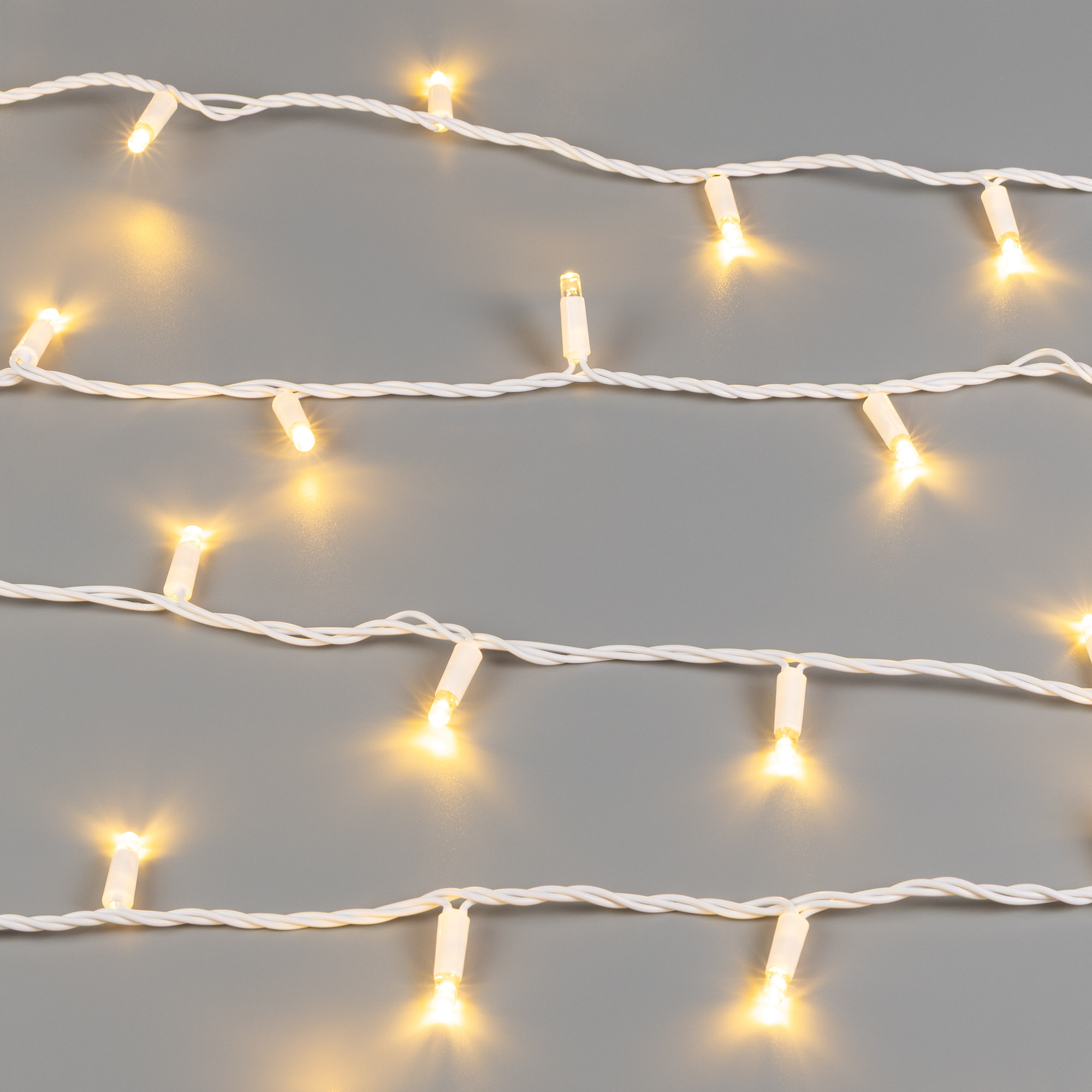 Светодиодная нить Pro. Размер 10000 мм. Цвет свечения ТЕПЛЫЙ БЕЛЫЙ (3000 К). 100 светодиодов размером 7 мм со статическим эффектом свечения с резким световым рисунком (прозрачная вогнутая линза). Провод белый, каучук. Питание 230 В, Мощность 7 Вт, защита IP65, применение в помещении и на улице под навесом. Аксессуары для подключения и управления приобретаются отдельно.