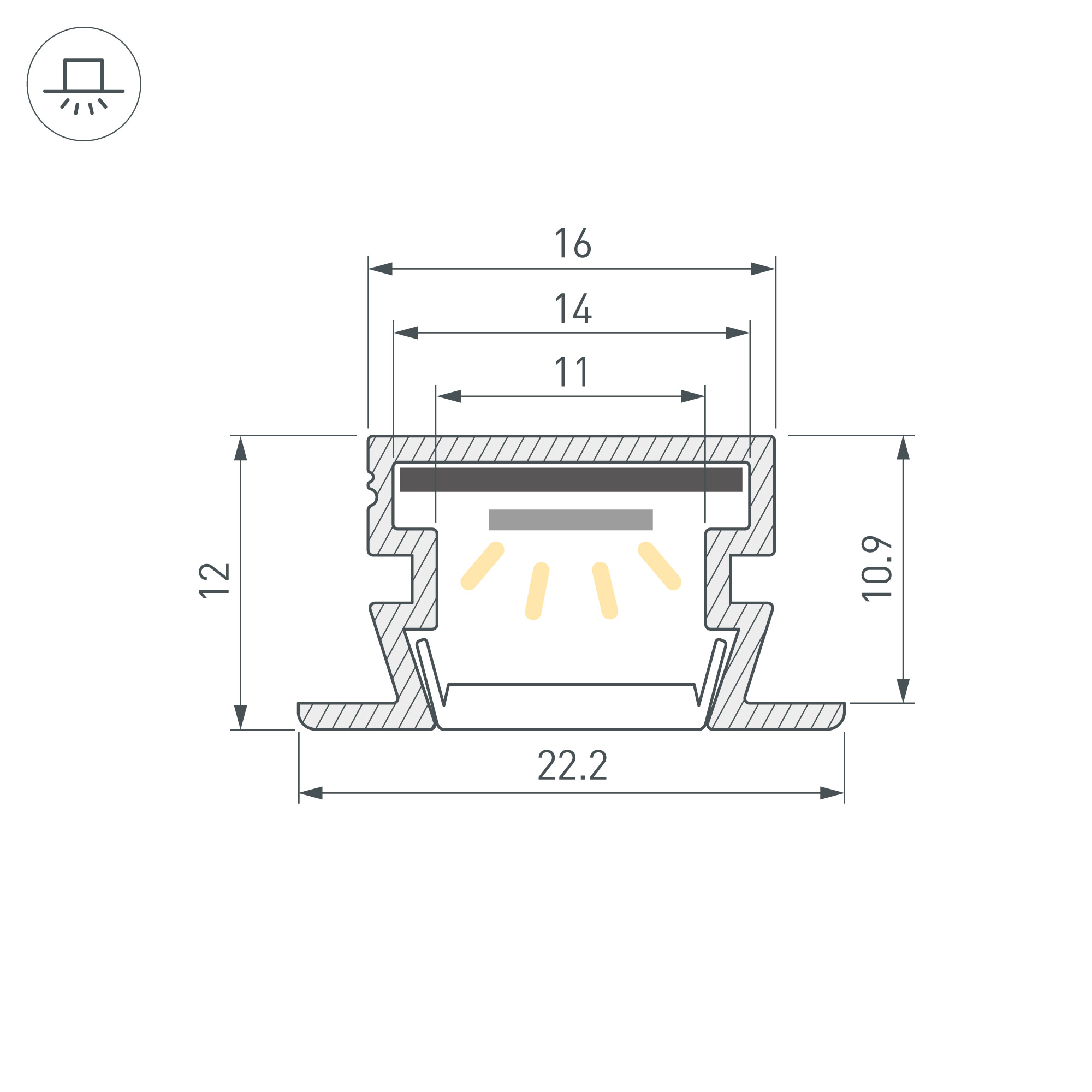 Встраиваемый профиль с накладным фланцем из анодированного алюминия для контурной подсветки. Габаритные размеры профиля составляют 2000 мм в длину, 22,2 мм в ширину и 12 мм в высоту. Площадка для установки светодиодных лент позволяет использовать ленту шириной до 14 мм и мощностью до 16,4 Вт/м. Это обеспечивает гибкость в выборе светодиодных лент и создает потрясающие световые решения. Экраны, заглушки и другие аксессуары не включены в комплект и приобретаются отдельно. Цена указана за 1 метр профиля. Отличное решение для создания современных световых проектов.