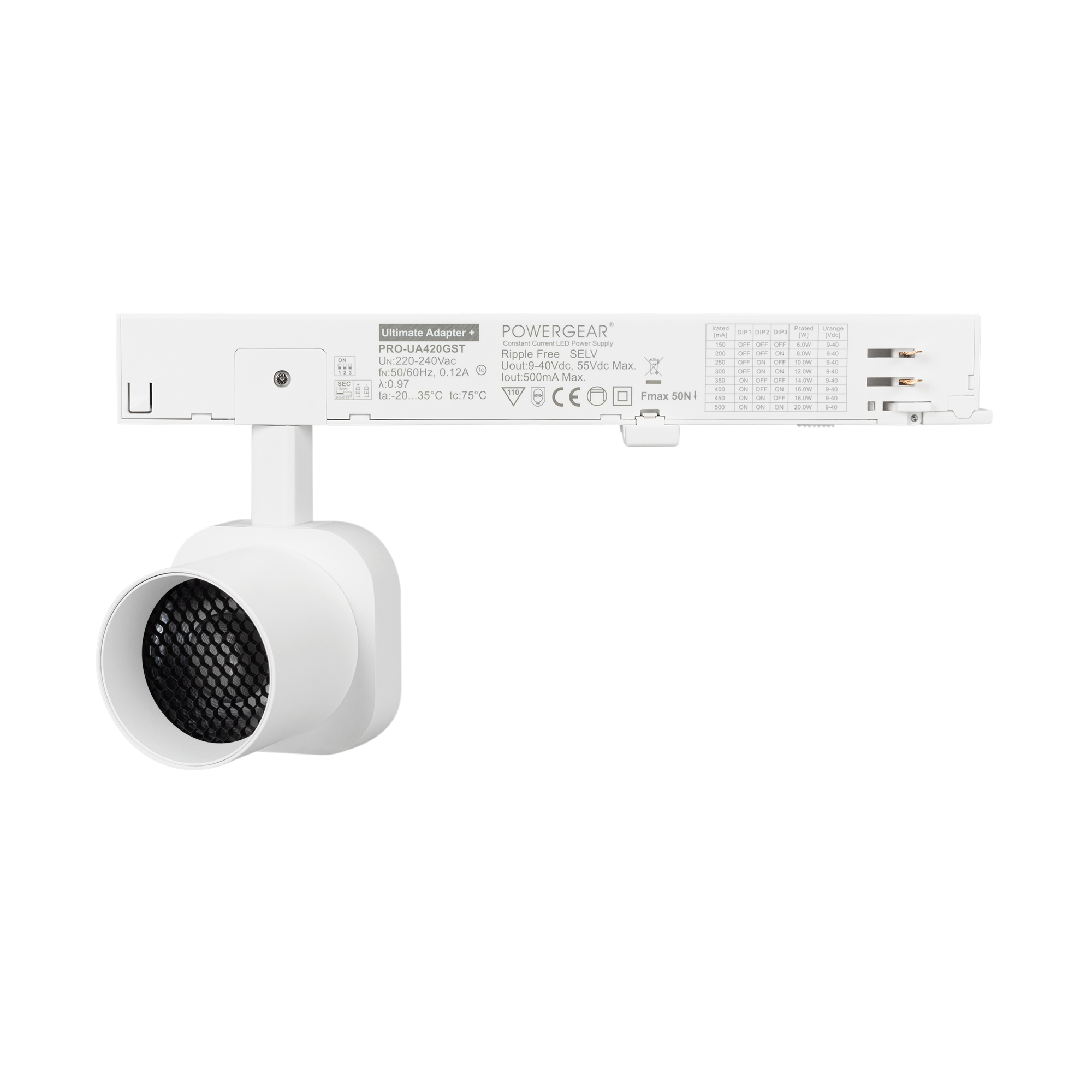 Светильник для треков/шин 4 провода. Мощность 10 Вт, св. поток 650 лм, 65 лм/Вт, теплый 3000 K, CRI>95, угол 20°, напряжение питания 230 В. Решетка HONEYCOMB в комплекте. Белый квадратный корпус из алюминия, материал линзы PC поликарбонат, степень защиты IP20. Размер световой части 60х60х62 мм. Монтаж на трек 3-фазный. Драйвер встроенный 9-40 В, 250мА., пульсация <1%