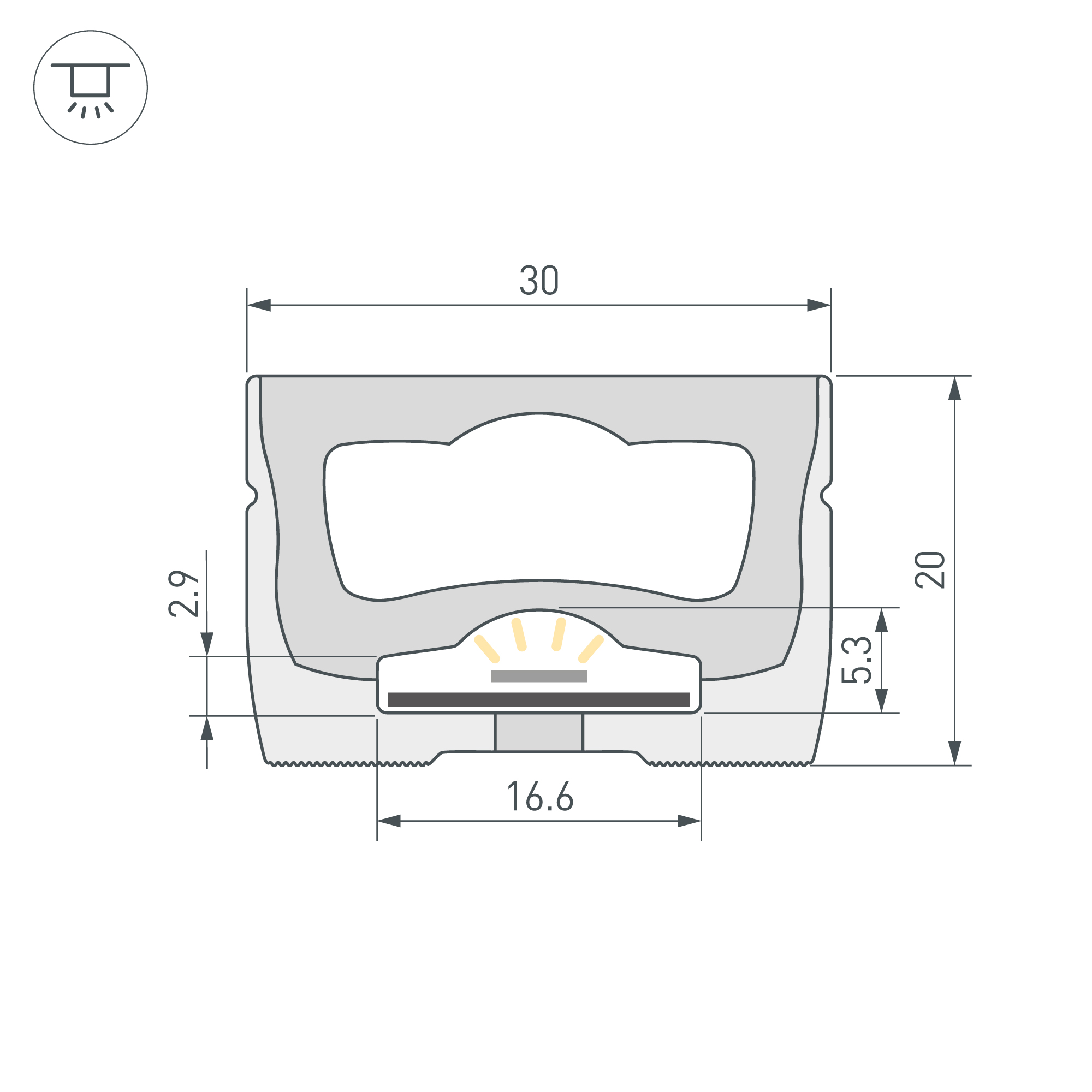 Цельнолитой силиконовый гибкий профиль белого цвета. Габаритные размеры профиля составляют 20000 мм в длину, 30 мм в ширину и 20 мм в высоту. Вертикальный изгиб TOP, минимальный радиус изгиба 60 мм. Угол излучения 118°. Для удобства установки ленты по всей длине профиля протянута нить. Площадка для установки светодиодных лент позволяет использовать ленту шириной от 12 до 15 мм, высотой до 4 мм и мощностью до 10 Вт/м. Это обеспечивает гибкость в выборе светодиодных лент и создает потрясающие световые решения. Для установки во влажных помещениях необходима герметизация при помощи двухкомпонентного эпоксидного герметика. Класс пылевлагозащиты – IP65 (при соблюдении технологии герметизации). Этот продукт представляет отличное решение для создания современных световых проектов и обеспечивает надежную и стильную основу для установки светодиодов. Для накладного монтажа на 1 метр профиля рекомендуем использовать не менее 3-х держателей. Подходит только для установки внутри помещения