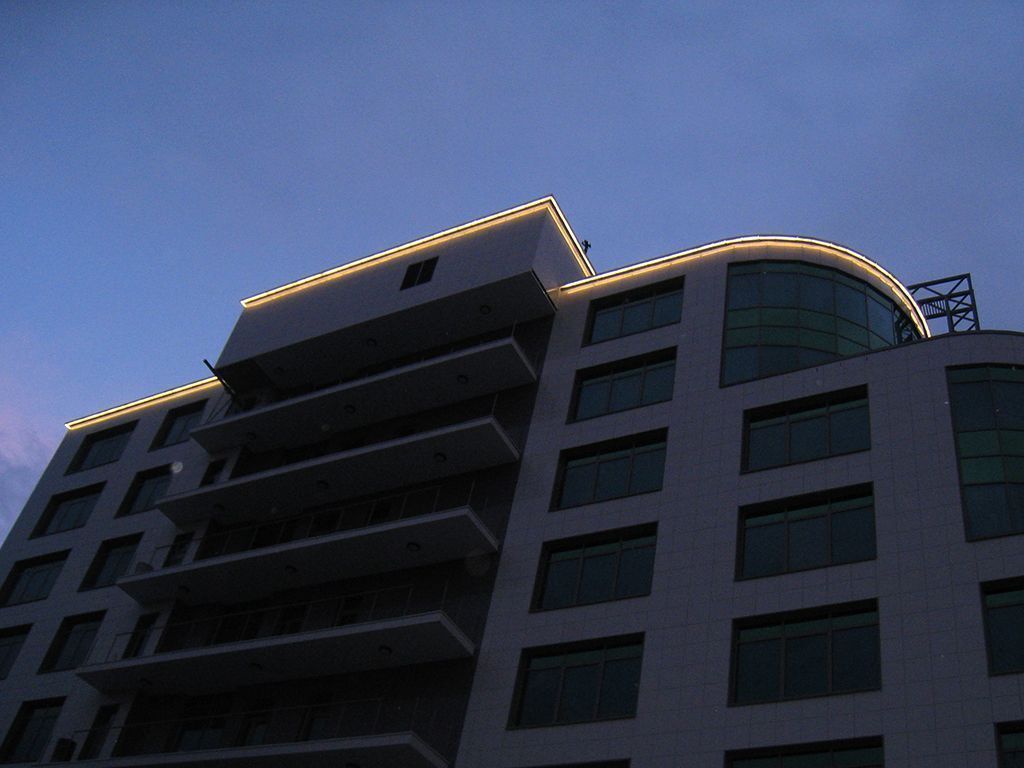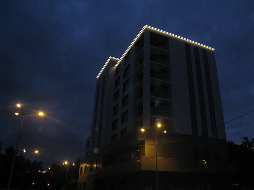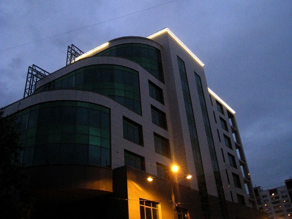 Подсветка была установлена по периметру крыши здания и обозначает её контуры. Свечение подсветки направлено вниз, на фасад строения.