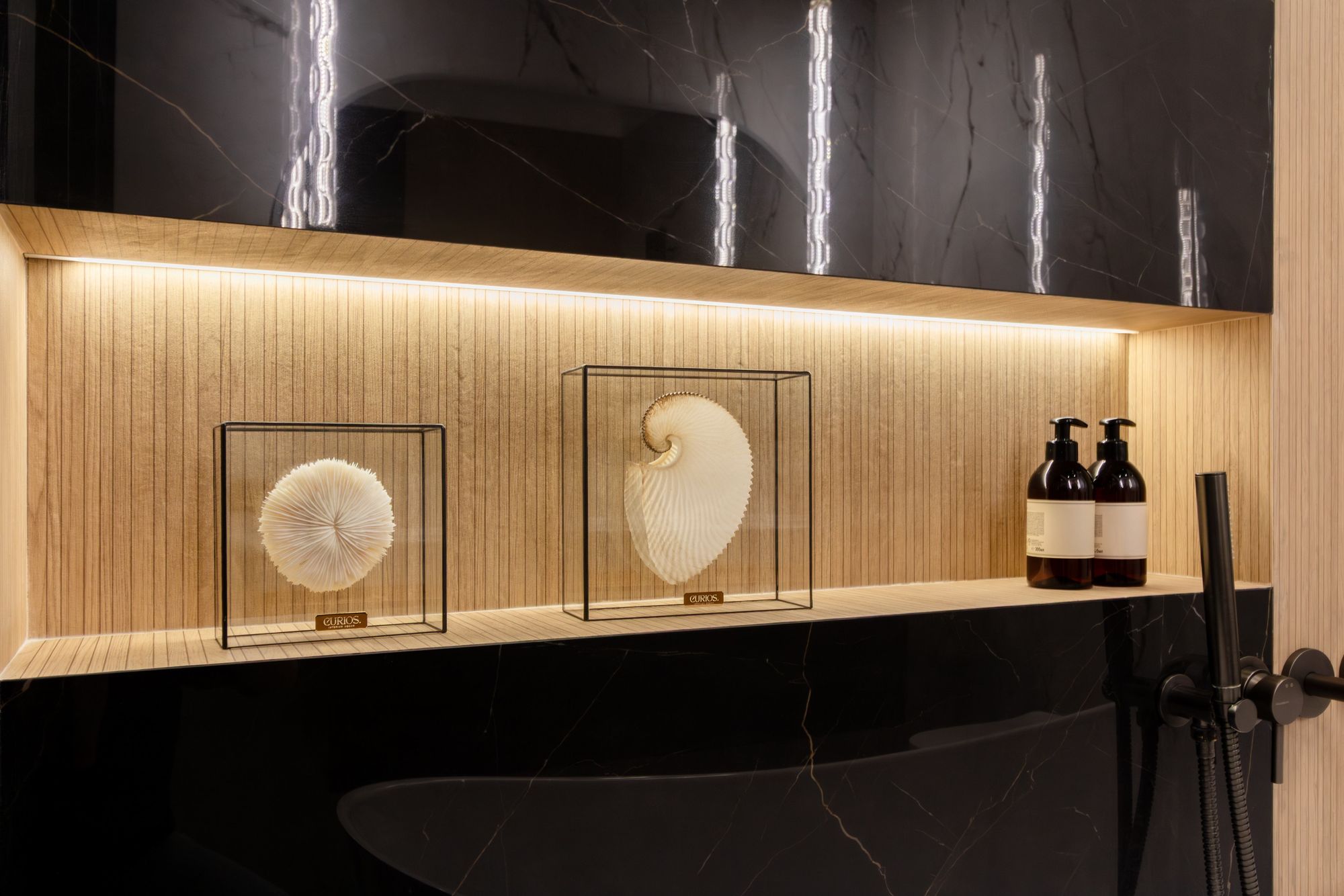 Основная цветовая температура в квартире — нейтральная, 4000 К. Однако подсветка, дающая ощущение уюта, чуть теплее — 3500 К.
