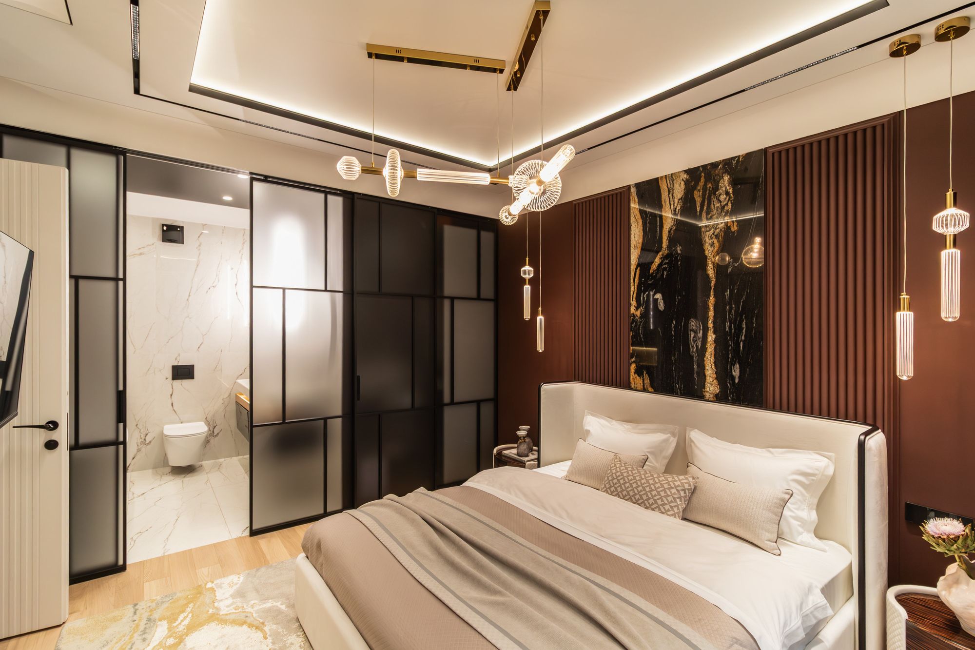 Даунлайты BUILT линейки DROP дизайнер задействовала в ванных комнатах, а поворотные светильники серии POLAR — в гардеробных. Кроме того, в одну из спален органично вписались лаконичные светильники BREEZE. «Они сдвоенные, и это дает возможность сделать пространство чище и одновременно выделить акцентами зоны», — объясняет Евгения.