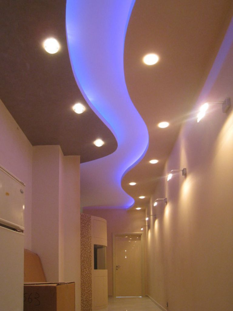 Третий вариант - закарнизная подсветка с точечными светильниками на многоуровневом потолке. Например, один уровень потолка подсвечивается светодиодной лентой, а на другом уровне установлены точечные светодиодные светильники.