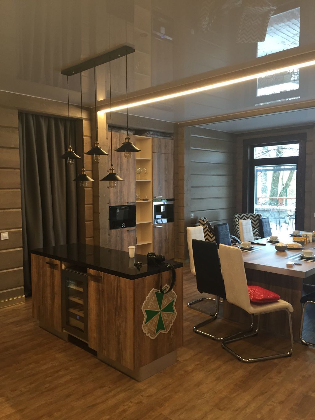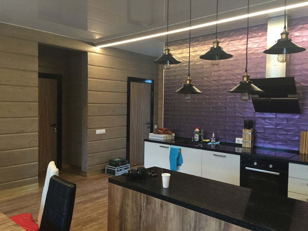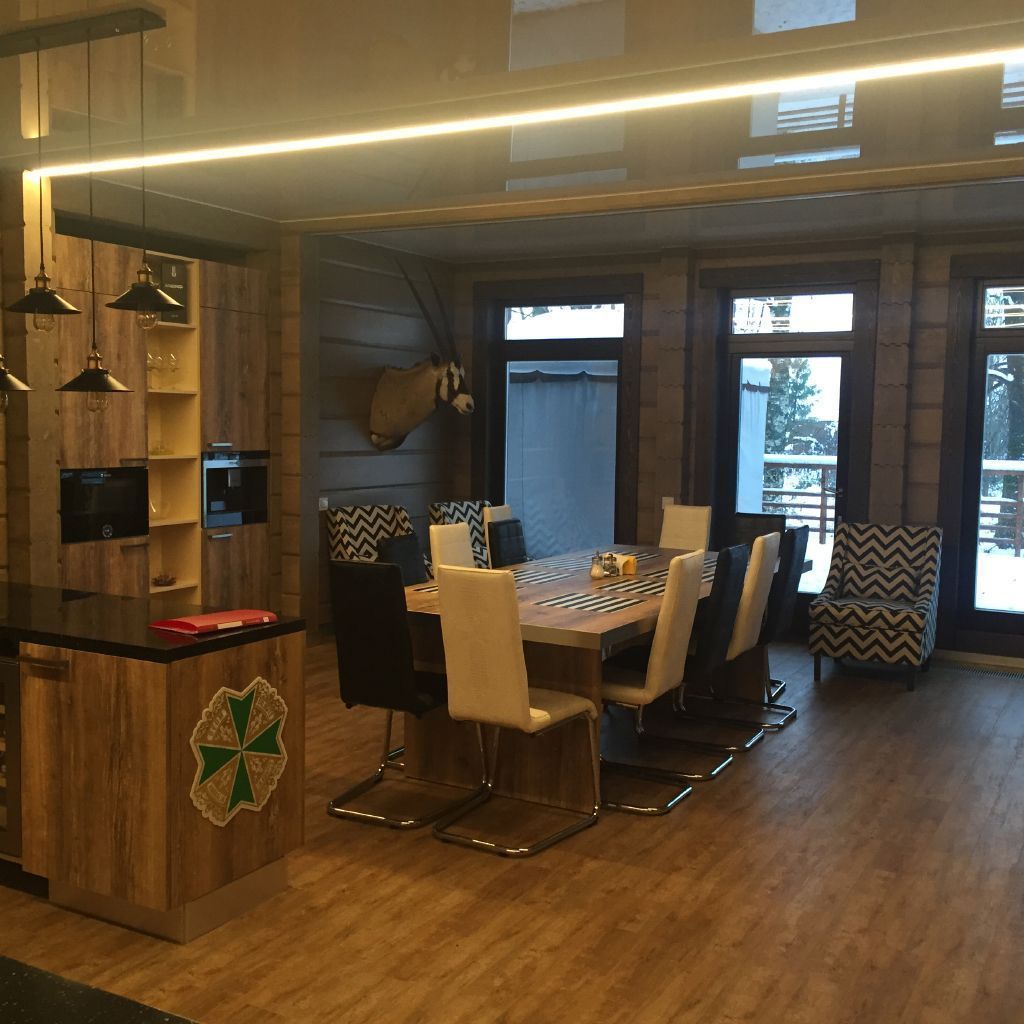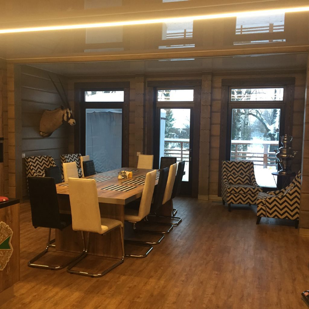 Освещение в загородном доме выполнено светодиодными светильниками, встроенными в потолочные балки. Корпуса светильников скрыты от глаз, а матовый экран находится на одном уровне с нижней плоскостью балки, благодаря чему создаётся эффект линий света. Для изготовления светильников была использована мощная светодиодная лента arlight® с современными светодиодами smd 2835, установленная во встраиваемый алюминиевый профиль для светодиодной ленты.