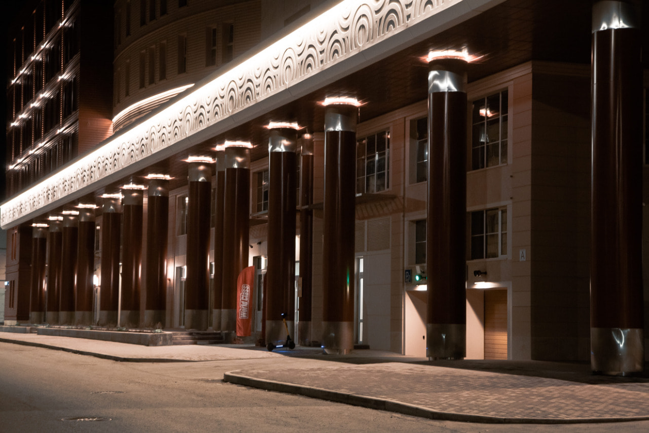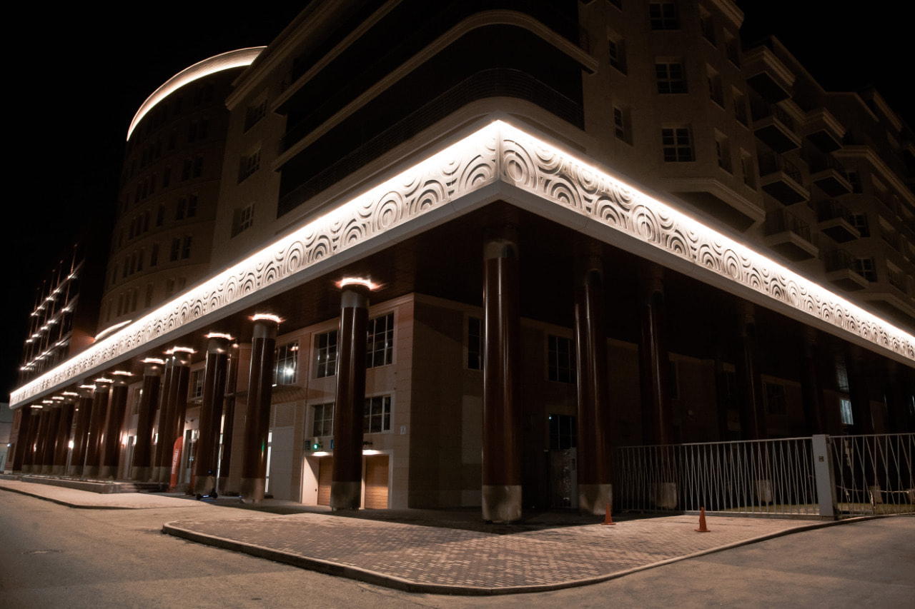 Подсветка фасадов выполнена на основе герметичной светодиодной ленты ARL PV C72 с цветовой температурой 3000 К. Теплый белый цвет свечения создает уютный и умиротворяющий облик здания и хорошо подходит для акцента классических декоративных элементов. Округлый орнамент на фризе оживает в свете подсветки, а рифленая поверхность фасада приобретает объем. Широкая подсветка верхнего и нижнего контура одного из корпусов плавно очерчивает строение в темное время суток.